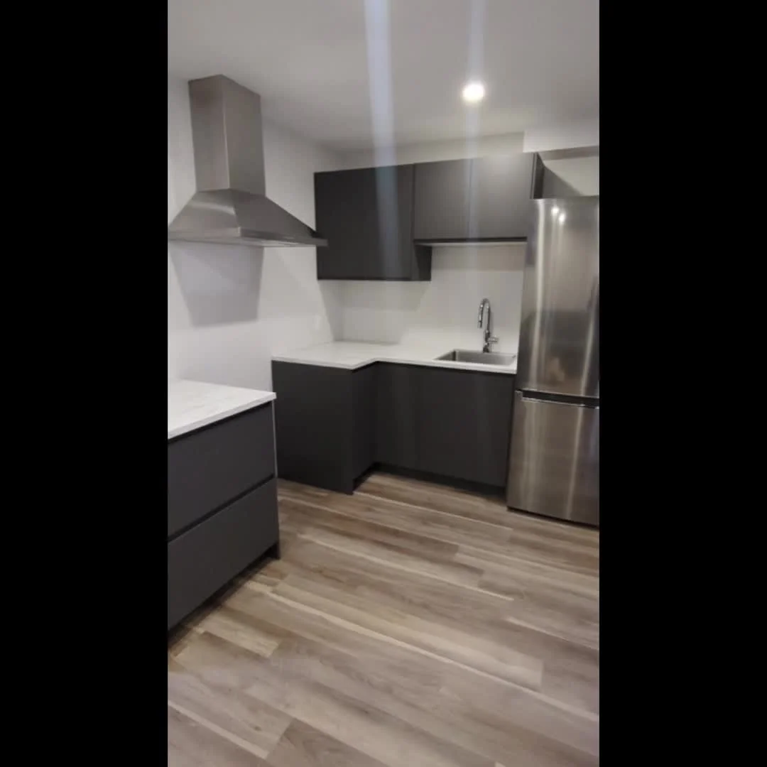 Installation et assemblage de meuble IKEA, de la pose des comptoirs, ainsi que du revêtement de plancher et du dosserets de céramique pour un résultat harmonieux et fonctionnel, avant de poursuivre avec les touches finales, telles que les moulures et les accessoires, pour compléter la rénovation et rendre l'espace prêt à être utilisé.